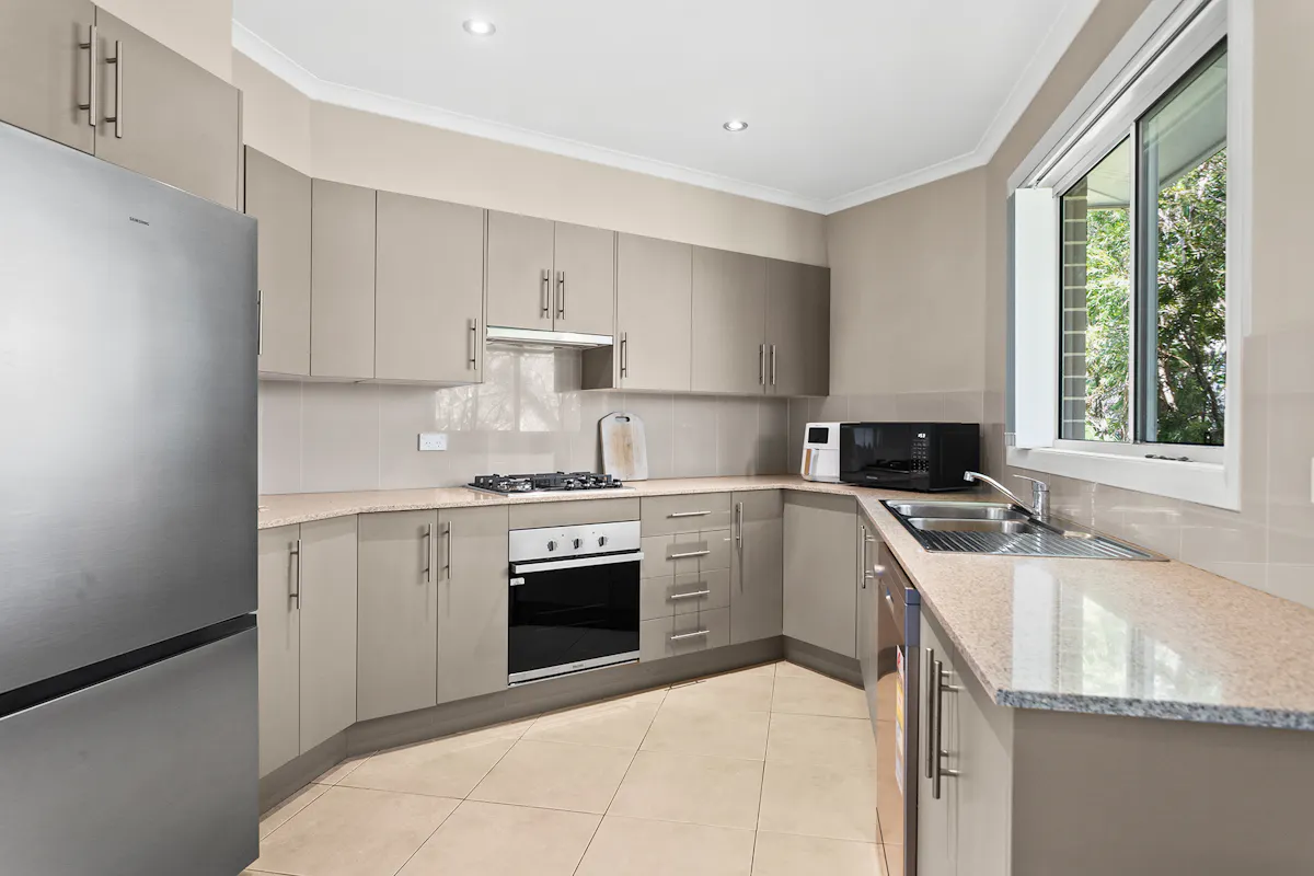 - Kitchen with stone benchtops, gas cooking & stainless appliances